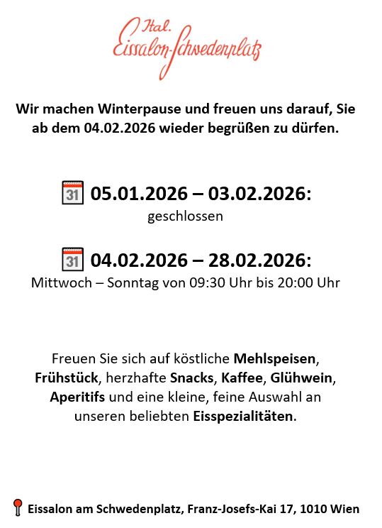 WINTERÖFFNUNGSZEITEN für unseren Standort in 1010 Wien (Eissalon am Schwedenplatz, Franz-Josefs-Kai 17): Mittwoch bis Sonntag von 11:00 Uhr bis 19:00 Uhr